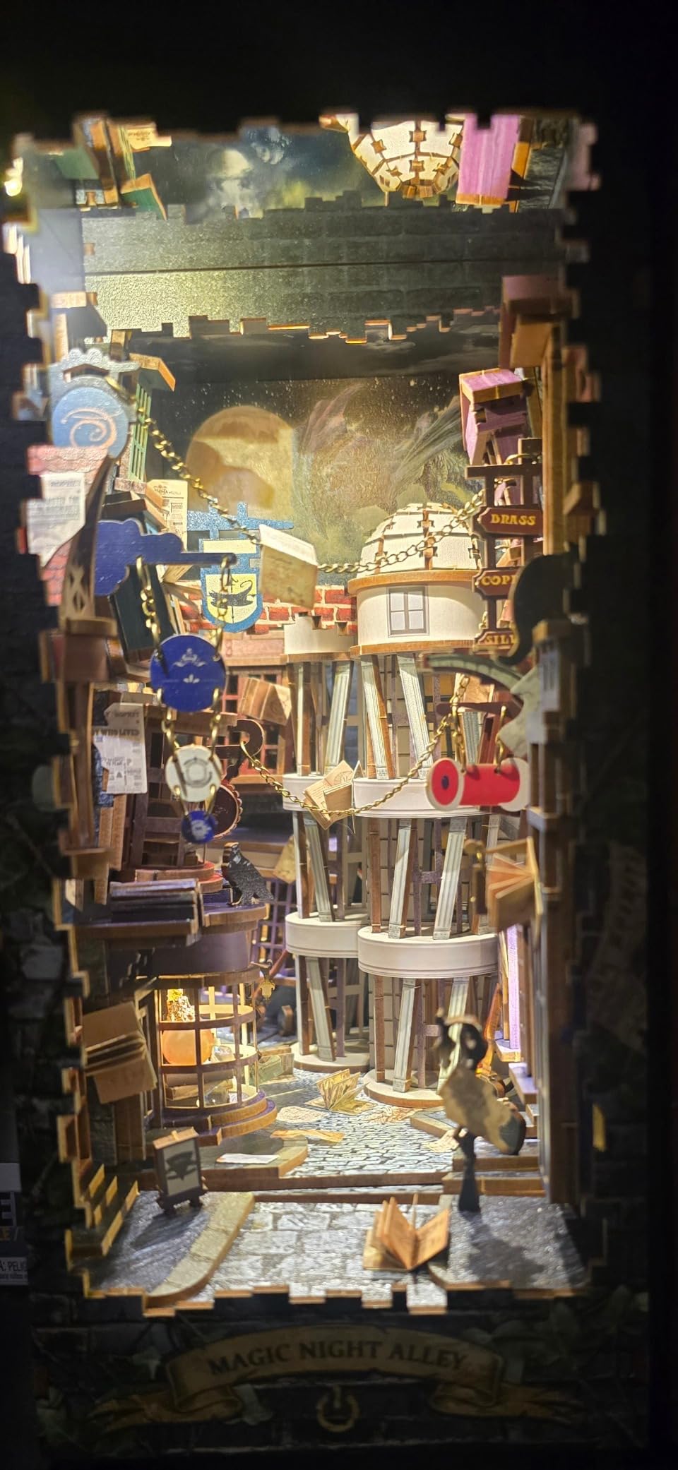 Place your Magic Alley book nook between your books and enjoy a cozy, glowing alleyway that brings a touch of magic to your shelf every time you walk by.